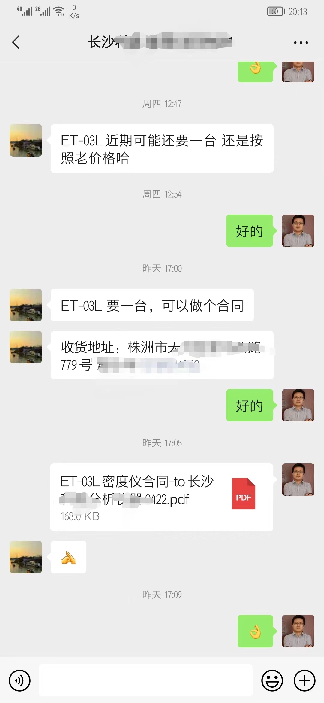 這位長沙的老客戶,前不久出了一臺液體密度計ET-03L的,有了合作的基礎,再次來訂購更是簡單直接了!感謝客戶關照!