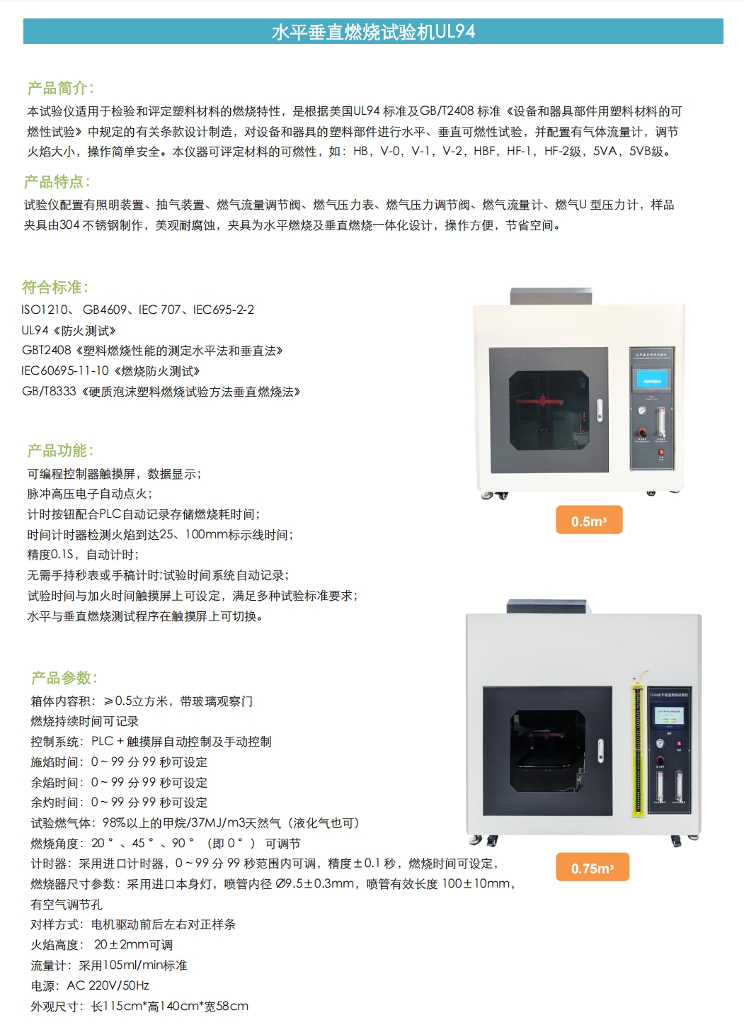 該設備用于測試材料的HB、V-0、5VA等阻燃等級,火焰功率分50W和500W兩種,通過調節火焰高度實現。改進后的操作手柄可精準控制火焰與試樣距離,適用于薄壁和溫度敏感材料,提升測試準確性。