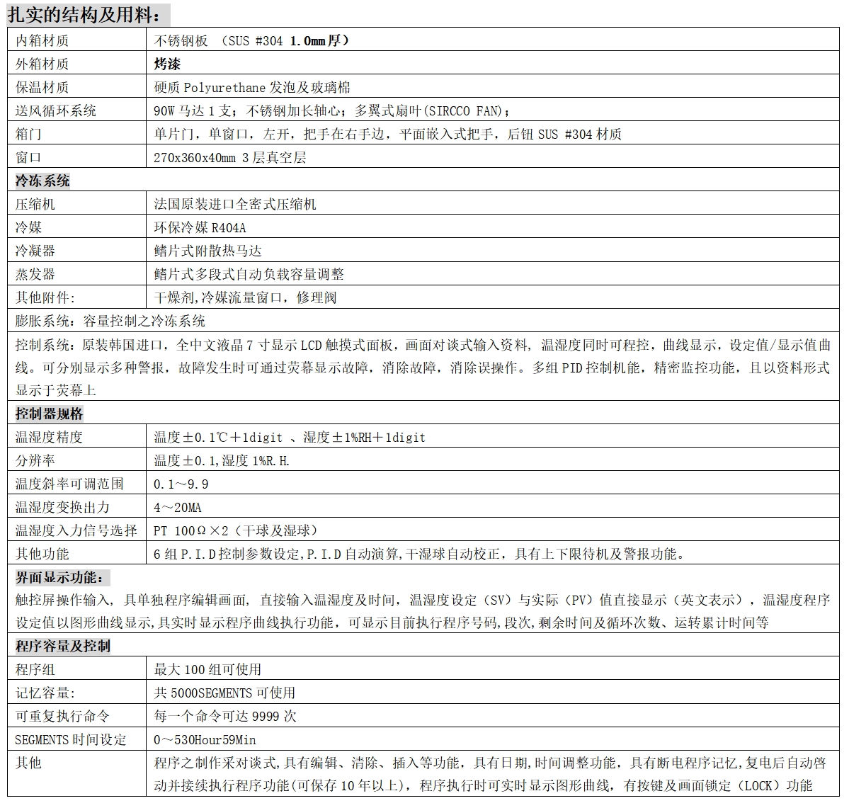 電源線4.0 mm2x3蕊;USB導出端子一個;不銹鋼SUS #304方型沖孔鋼板置物架2片;不銹鋼可調整間距40mm置物架軌道2組;11W節能照明窗口燈一支;機體左側ψ50mm測試孔1個(附不銹鋼孔蓋1只,硅膠塞頭1只);標準測試用不織布1片;控制器使用說明書一套;操作說明書一套。